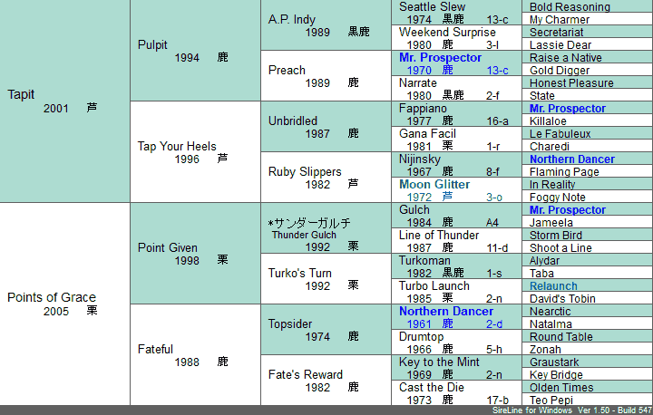 | 5代クロス | 父系×母系 Mr. Prospector 4*5×5,Northern Dancer 5×4,Moon Glitter=Relaunch 4×5父系内のみ なし母系内のみ なし | |
