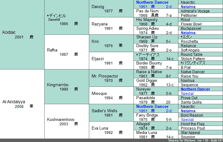 | 5代クロス | 父系×母系 Northern Dancer 4×5*4,Natalma 5*5×5父系内のみ なし母系内のみ Special 5*5 | |