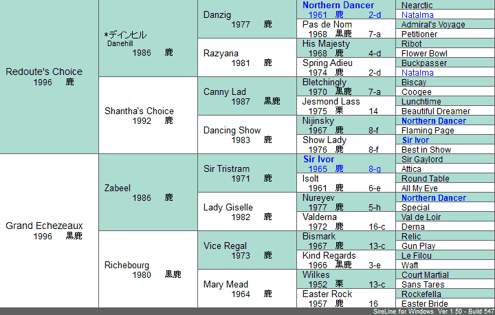 | 5代クロス | 父系×母系 Northern Dancer 4*5×5,Sir Ivor 5×4父系内のみ Natalma 5*5母系内のみ なし | |