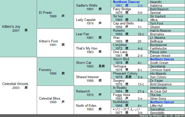 | 5代クロス | 父系×母系 Northern Dancer 4×5*5父系内のみ なし母系内のみ なし | |
