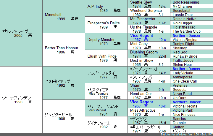 | 5代クロス | 父系×母系 Vice Regent 4×4,Northern Dancer 5×5*5父系内のみ なし母系内のみ なし | |