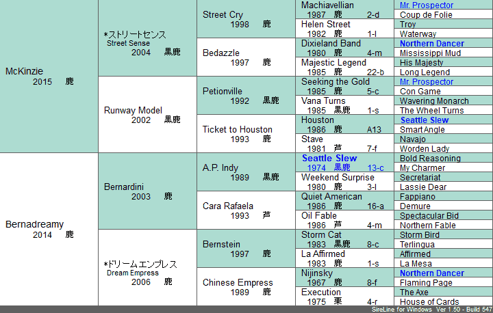 | 5代クロス | 父系×母系 Seattle Slew 5×4,Northern Dancer 5×5父系内のみ Mr. Prospector 5*5母系内のみ なし | |