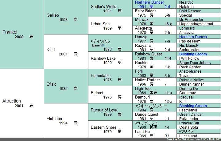| 5代クロス | 父系×母系 Blushing Groom 5×5父系内のみ Northern Dancer 4*5母系内のみ なし | |