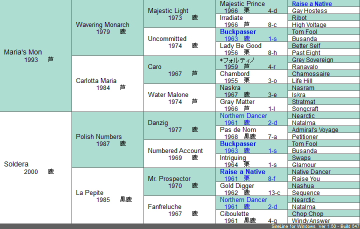 | 5代クロス | 父系×母系 Buckpasser 4×4,Raise a Native 5×4父系内のみ なし母系内のみ Northern Dancer 5*5 | |