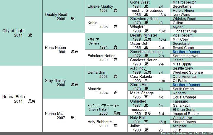| 5代クロス | 父系×母系 Northern Dancer 5×5父系内のみ なし母系内のみ なし | |