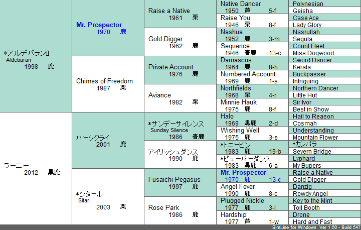 | 5代クロス | 父系×母系 Mr. Prospector 2×4父系内のみ なし母系内のみ なし | |