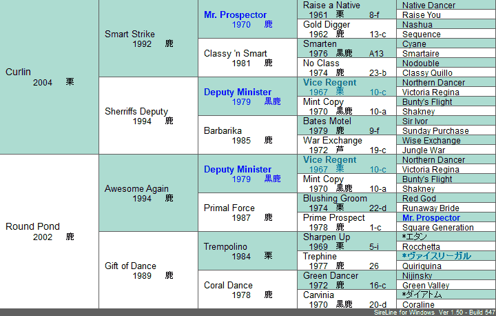 | 5代クロス | 父系×母系 Deputy Minister 3×3,Mr. Prospector 3×5,Vice Regent=*ヴァイスリーガル 4×4*5父系内のみ なし母系内のみ なし | |
