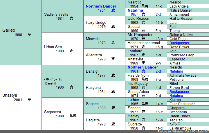 | 5代クロス | 父系×母系 Northern Dancer 3×4,Natalma 4×5*5,Buckpasser 5×5父系内のみ なし母系内のみ なし | |