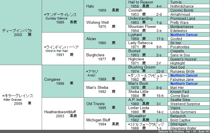 | 5代クロス | 父系×母系 Northern Dancer 5×5*5父系内のみ なし母系内のみ なし | |