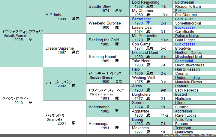 | 5代クロス | 父系×母系 5代前までアウトクロス父系内のみ Secretariat 4*5,Buckpasser 5*5母系内のみ なし | |