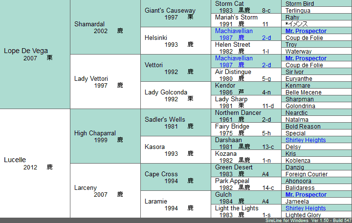 | 5代クロス | 父系×母系 Mr. Prospector 5*5×5父系内のみ Machiavellian 4*4母系内のみ Shirley Heights 5*5 | |
