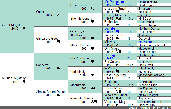 | 5代クロス | 父系×母系 Danzig 4×4父系内のみ Mr. Prospector 4*5母系内のみ なし | |