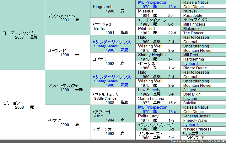 | 5代クロス | 父系×母系 *サンデーサイレンス 3×3,Mr. Prospector 4×4,Lyphard 5×5父系内のみ なし母系内のみ なし | |