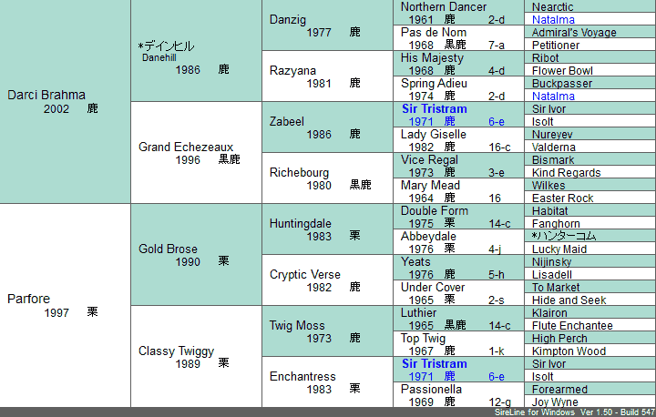 | 5代クロス | 父系×母系 Sir Tristram 4×4父系内のみ Natalma 5*5母系内のみ なし | |