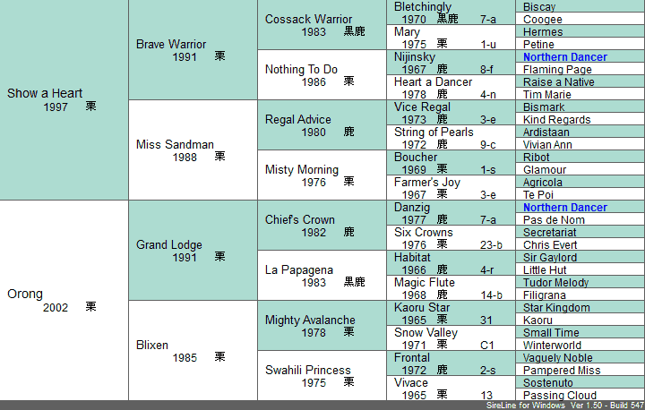 | 5代クロス | 父系×母系 Northern Dancer 5×5父系内のみ なし母系内のみ なし | |
