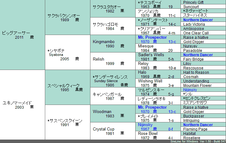 | 5代クロス | 父系×母系 Mr. Prospector 4×4,Northern Dancer 5*5×5父系内のみ なし母系内のみ Nijinsky 5*4 | |
